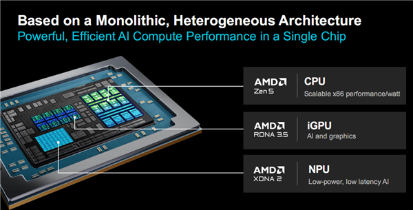 它采用了异构架构的单芯片设计,一颗芯片内,就集成了Zen 5架构的CPU x86计算引擎、RDNA 3.5架构的GPU AI与图形引擎、XDNA 2架构的NPU AI引擎,提供性能强大、能效极高的AI计算平台。