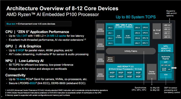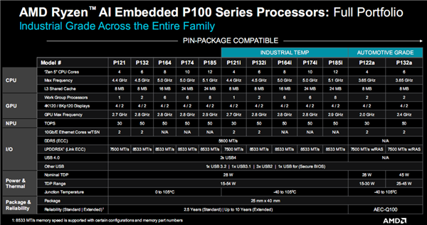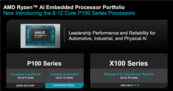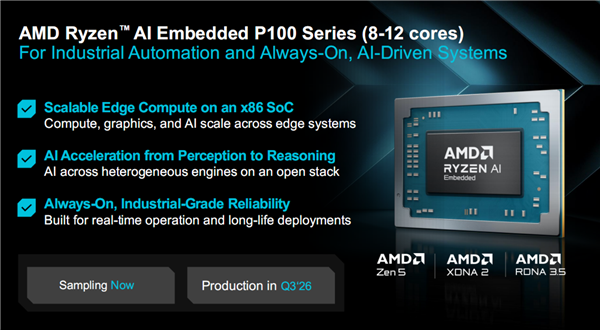 8-12核心的锐龙AI嵌入式P100系列处理器已经在试产,将在第三季度投入大规模量产,同时配套的开发文档和工具已经准备就绪。