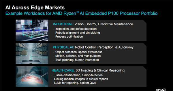 顺带预告一下,今年下半年,AMD还将再接再厉继续推出“锐龙AI嵌入式X100系列”,最多达16个核心,主要用于自动化系统物理AI等尖端领域,驱动AI技术与应用的全新飞跃。