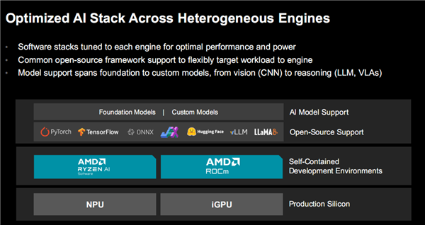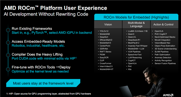 得益于AMD ROCm开放软件生态系统的支持,锐龙嵌入式处理器所运行的嵌入式应用,已经有了一整套经过广泛验证的开源AI软件栈,覆盖视觉、多模态与语言、动作与控制等各个层面。