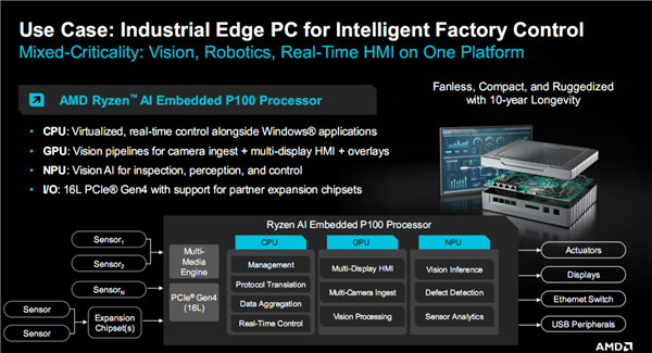 诸如智能工厂里的工业PC、PLC、HMI(人机交互界面)、工业机械臂,物理AI领域的机器人、机器狗,以及医疗健康、影视广播、半导体制造与测试,锐龙AI嵌入式P100系列都能如鱼得水。