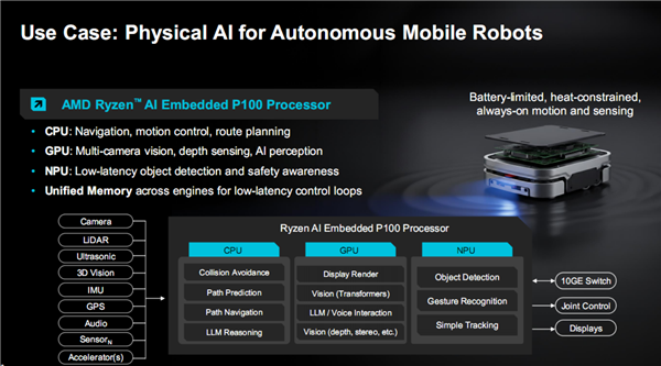 针对移动机器人,锐龙AI嵌入式P100系列可以在CPU上管理导航、运动控制与路径规划,GPU则处理多路摄像头数据,实现空间感知、视觉SLAM、视觉-语言-动作(VLA)等高级AI工作负载。